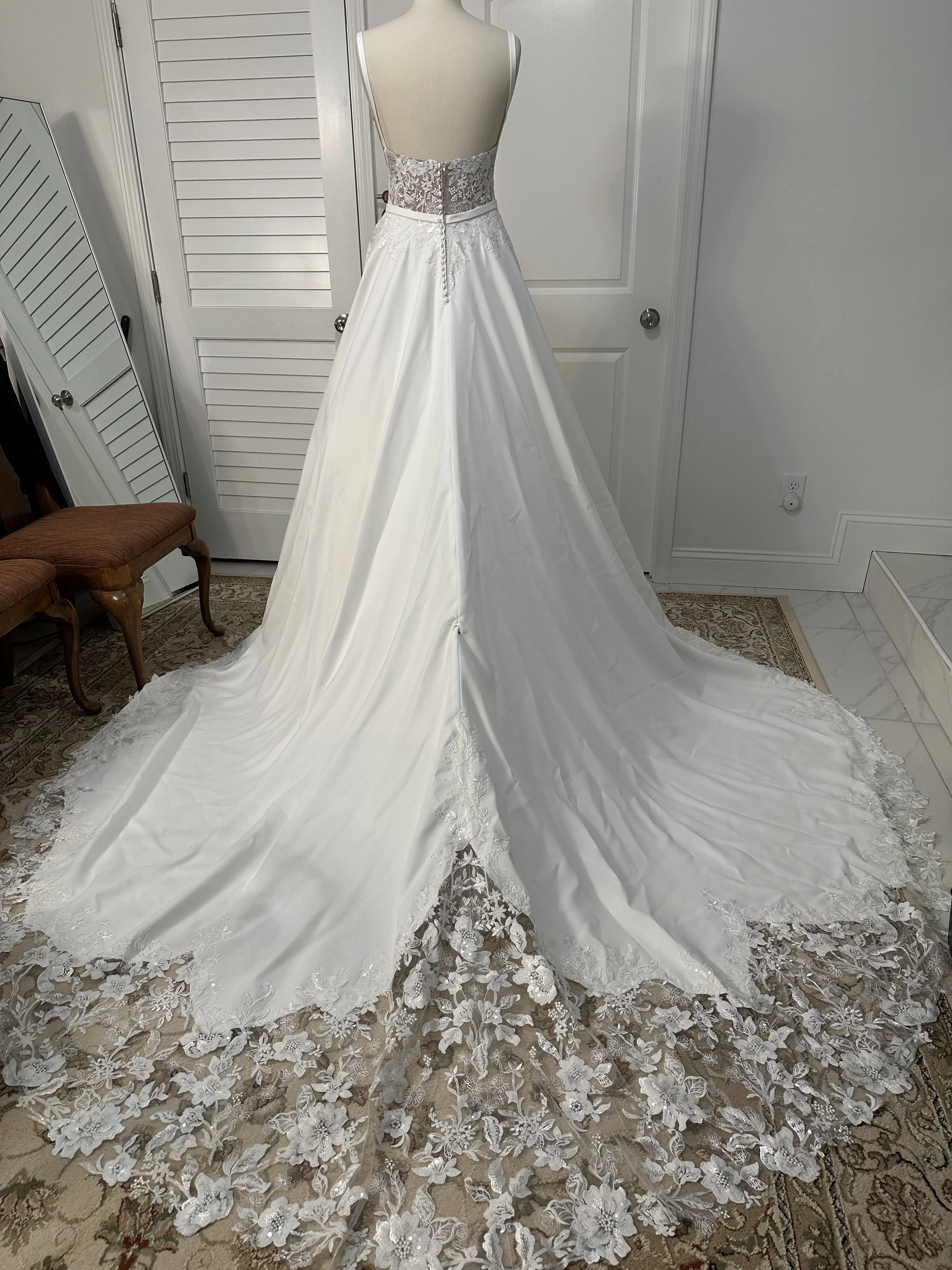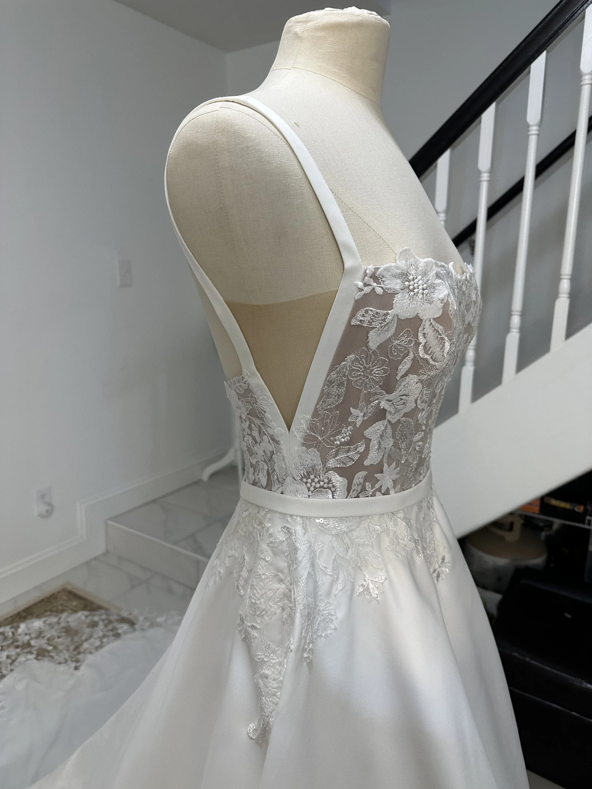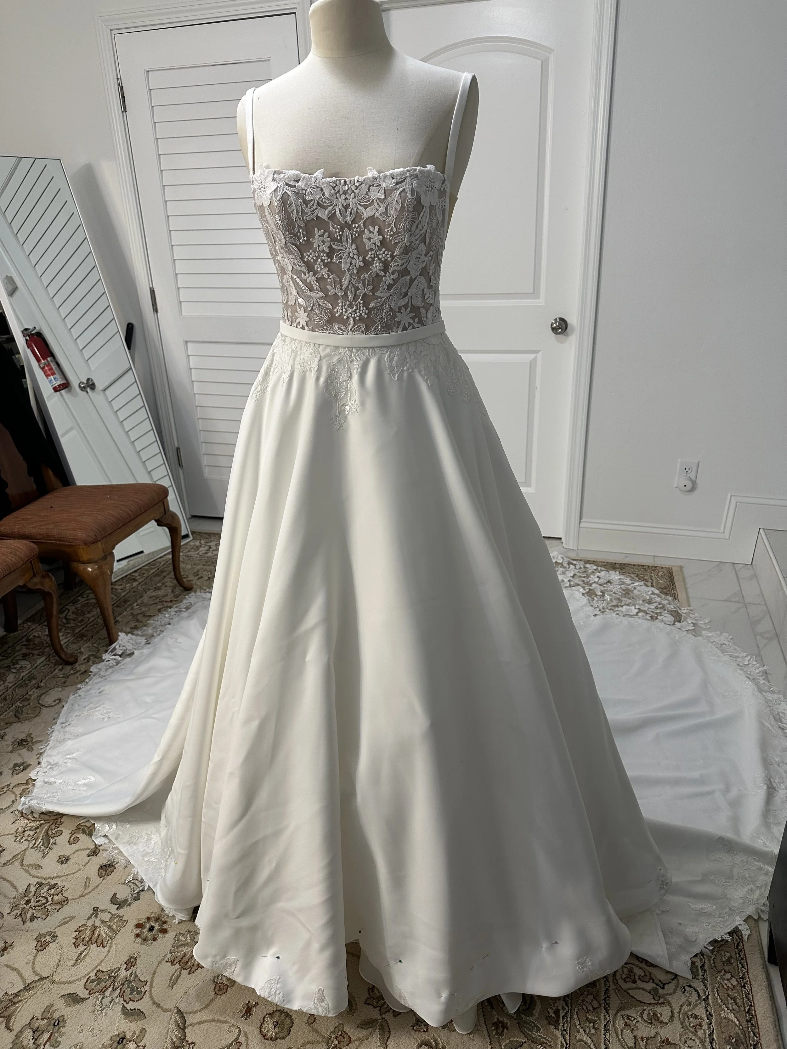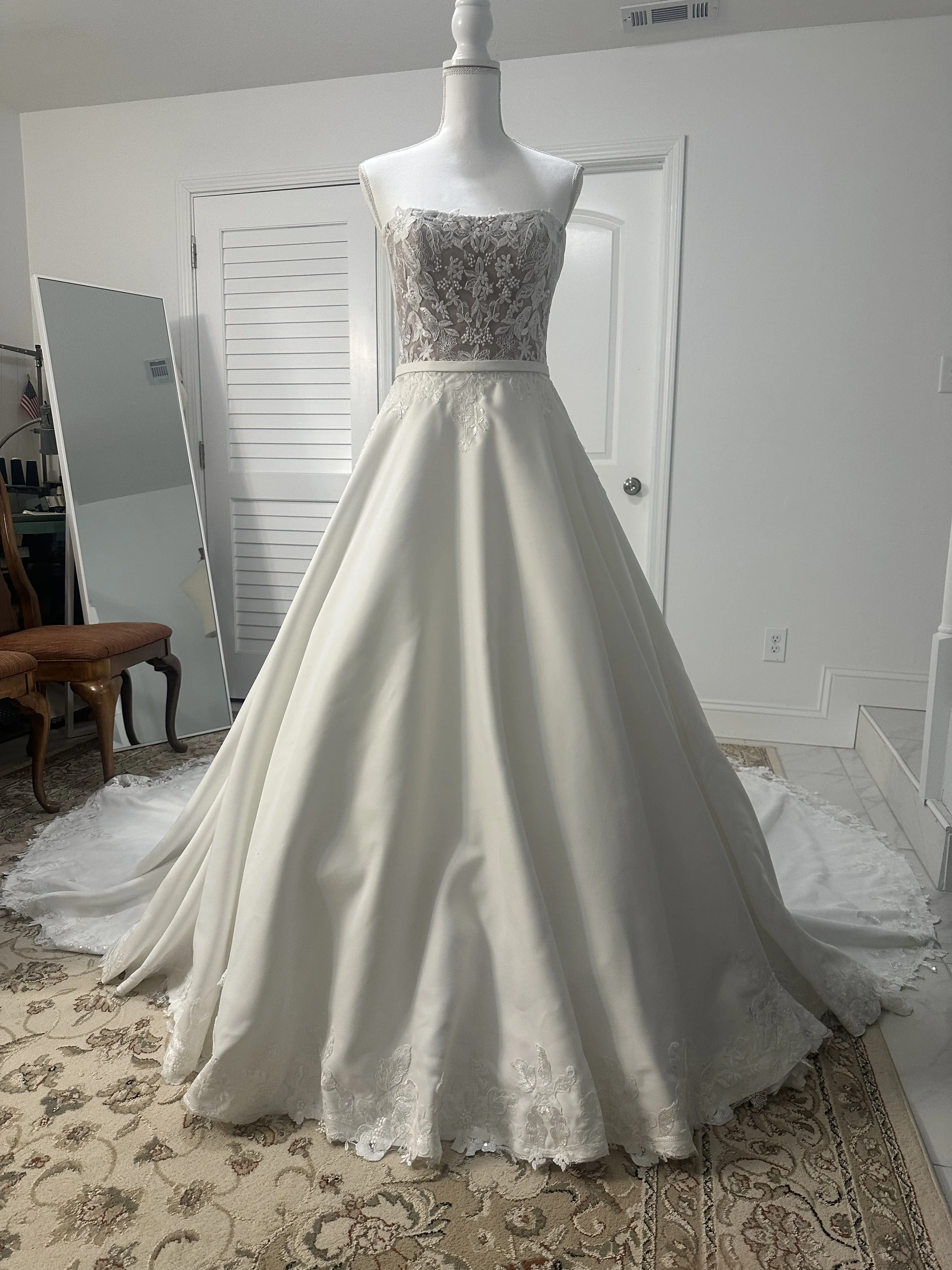 After/ Hem shortened with six layers. Floral appliques carefully removed and hand sewn back after hemming. Straps removed and side bodice redesigned